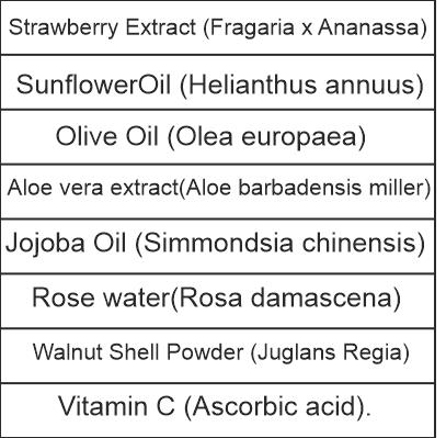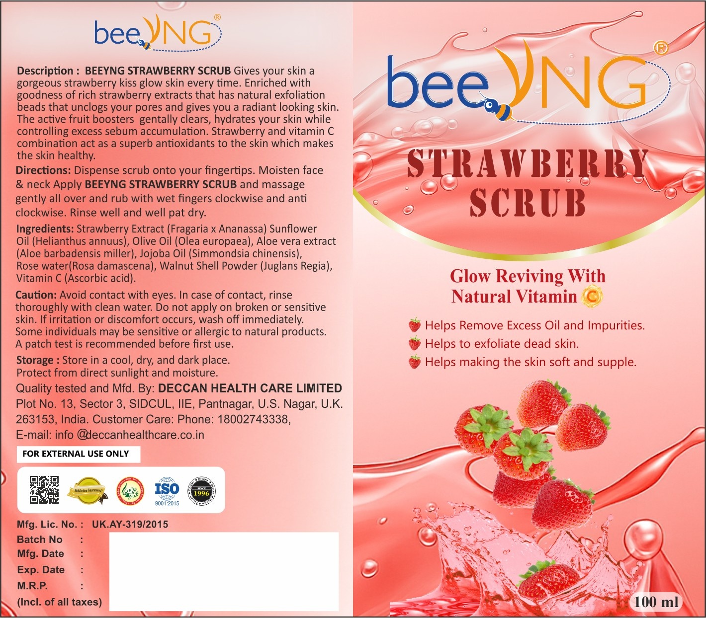 The beeYNG Strawberry Scrub is a skincare product for the face. It is formulated with natural strawberry extract and Vitamin E to provide a "Glow Reviving" effect. The scrub's primary function is to gently exfoliate dead skin cells and remove impurities by unclogging pores. It is also designed to help remove excess oil and restore the skin's natural freshness and radiance, making the skin soft and healthy. The instructions indicate it should be used on a moistened face.