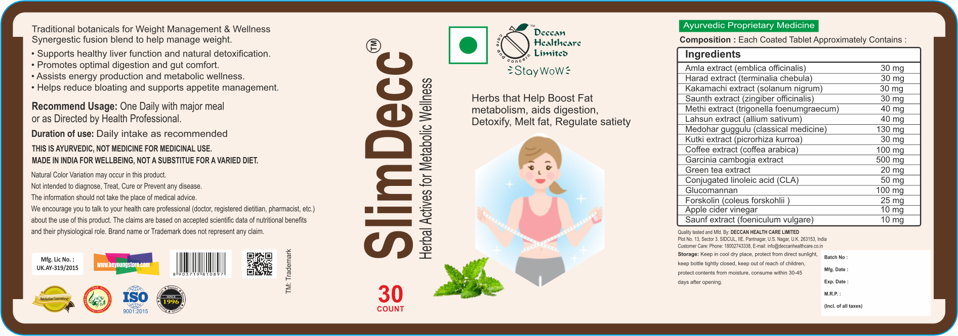 SLIMDECC is a dietary supplement formulated with herbal actives to support metabolic wellness and assist with weight reduction. The product claims to be a "safe effective prepration" [sic] that works by burning fat more quickly and efficiently, preventing further fat accumulation, and managing cravings associated with emotional eating. It is marketed as a way to "loose your weight scientifically way" [sic] and help individuals achieve a "fit, slim, & attractive" look.