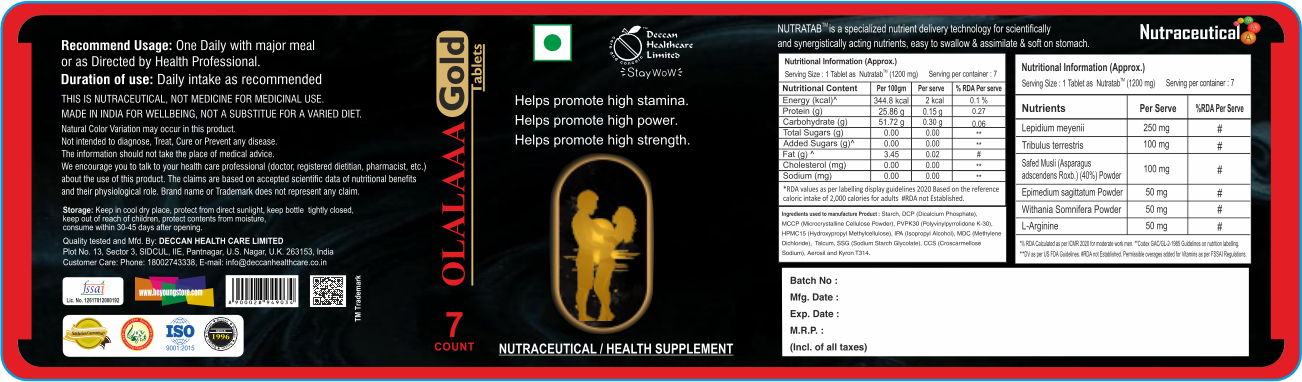 OLALAAA Gold Tablets are a health supplement from Deccan Healthcare Limited that claim to enhance sexual energy. The product is marketed to help with sexual dysfunction in both men and women by promoting "high stamina," "high power," and "high strength." It comes in a bottle containing 7 tablets and is categorized as a nutraceutical and health supplement. The imagery and text on the product suggest its primary purpose is to improve sexual vitality and performance.
