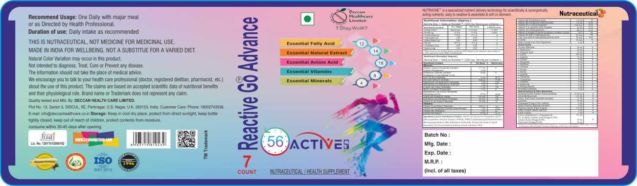 REACTIVE GO ADVANCE from Deccan Healthcare Limited is a daily energy-boosting supplement. It contains 56 active ingredients, including "Essential Fatty Acid," "Essential Natural Extract," "Essential Amino Acid," "Essential Vitamins," and "Essential Minerals." The product is marketed to activate energy, particularly for high-energy activities like High-Intensity Interval Training (HIIT), but also for general daily use. It is positioned as a comprehensive blend of essential nutrients to support energy and performance.